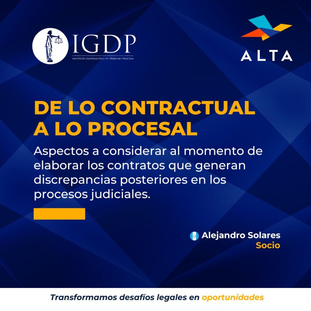 Momentos destacados de nuestro socio Alejandro Solares M. en el panel “De lo contractual a lo procesal: aspectos a considerar al momento de elaborar los contratos que generan discrepancias posteriores en los procesos judiciales” organizado por INSTITUTO GUATEMALTECO DE DERECHO PROCESAL
