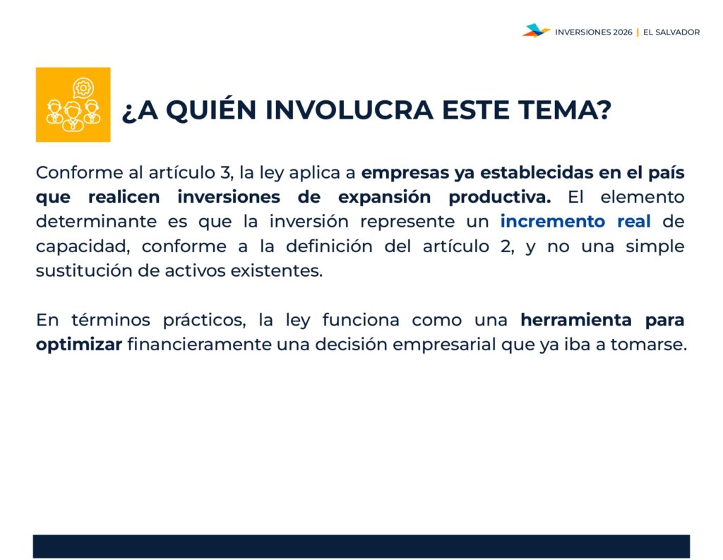 La normativa beneficia a empresas que realicen expansiones reales de capacidad, ofreciendo incentivos como crédito fiscal y exención de impuestos, siempre sujetos a calificación previa y al cumplimiento de los requisitos establecidos.