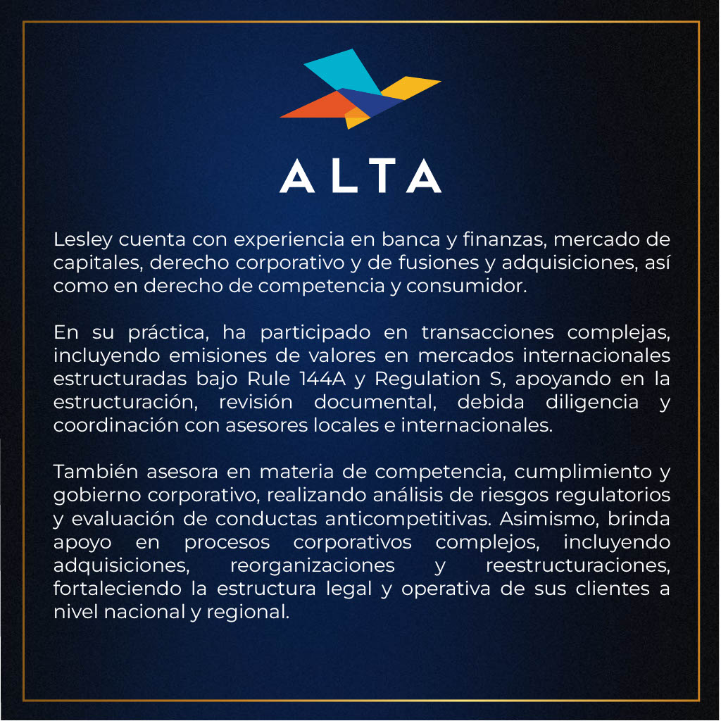 En su práctica, Lesley ha participado en transacciones complejas, incluyendo emisiones internacionales bajo Rule 144A/Reg S, financiamientos estructurados y créditos sindicados. Asimismo, apoya en adquisiciones, reorganizaciones y en el análisis de competencia, riesgos regulatorios y gobierno corporativo a nivel regional.