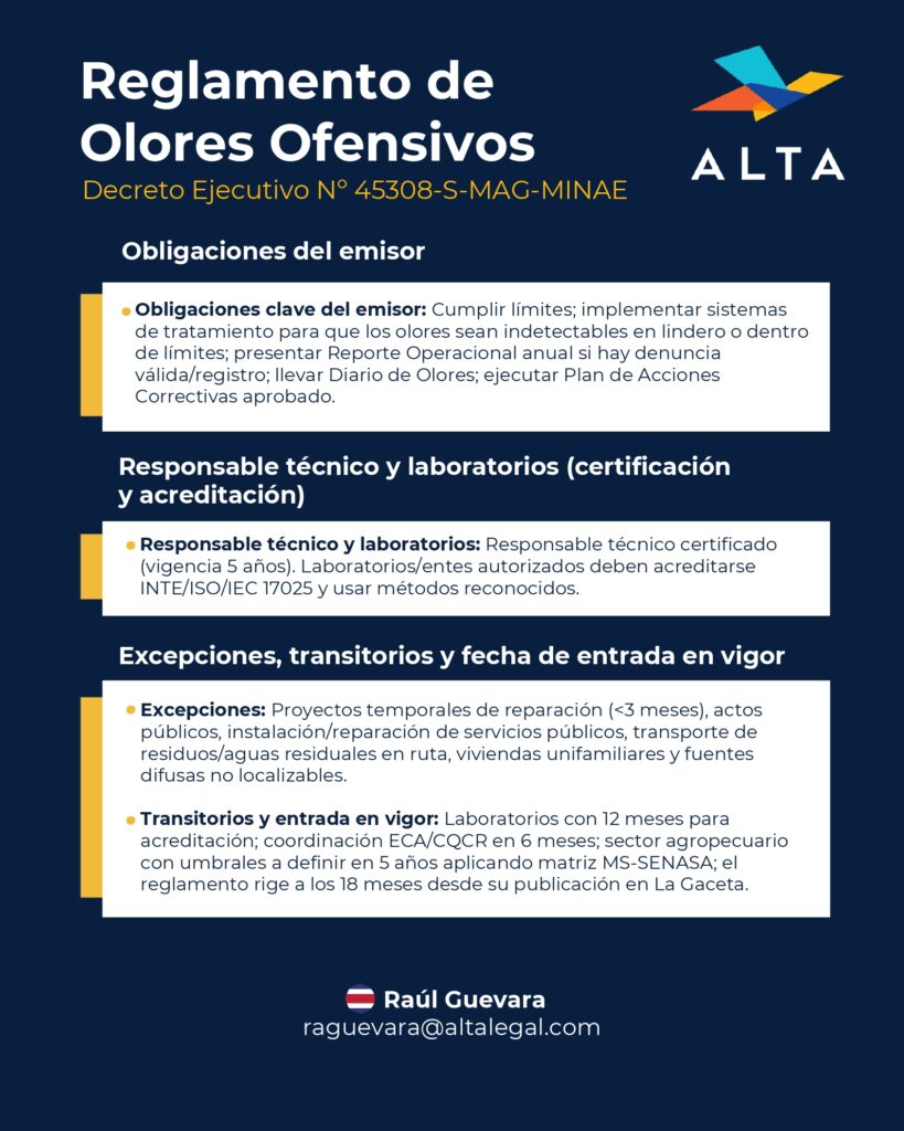 Nuestro socio Raúl Guevara nos presenta los aspectos esenciales del Decreto Ejecutivo N.° 45308-S-MAG-MINAE: límites permitidos, métodos de medición, proceso de denuncias, responsabilidades de los emisores y plazos para la implementación.